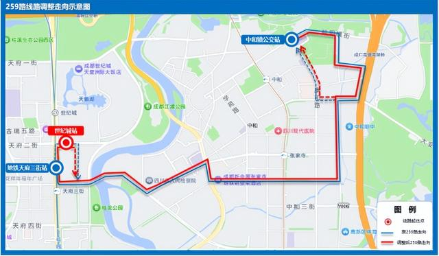 259路 起訖點(diǎn):中和鎮(zhèn)公交站——世紀(jì)城路 線路走向:中和鎮(zhèn)公交站出發(fā),按原線路行駛至地鐵天府三街站后,調(diào)整線路經(jīng)天府大道、世紀(jì)城路后到達(dá)世紀(jì)城路站(終點(diǎn)站) ?。ǚ党蹋┱{(diào)整線路從世紀(jì)城路出發(fā),經(jīng)天華路、天華一路后回原線行駛至康和路朝陽(yáng)路口(終點(diǎn)站)。