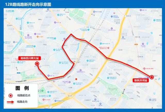 12B路 起訖點(diǎn):地鐵洪河站——地鐵四川師大站 線路走向:地鐵洪河站發(fā)出,經(jīng)驛都大道、靜明路、劼人路、菱窠路、中環(huán)路錦繡大道段、靜安路后到達(dá)地鐵四川師大站(終點(diǎn)站) (返程)地鐵四川師大站發(fā)出,經(jīng)菱安路、靜安路中環(huán)路錦繡大道段、菱窠路、劼人路、靜明路、驛都大道后到達(dá)地鐵洪河站(終點(diǎn)站)。