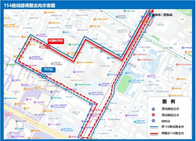 154路 起訖點(diǎn):荷花池公交站——梓潼橋西街 線路走向:荷花池公交站發(fā)出,按原線路行駛至梓潼橋西街(終點(diǎn)站) ?。ǚ党蹋┱{(diào)整線路從梓潼橋西街站發(fā)出,經(jīng)純陽(yáng)觀街、華興正街、華興東街后回原線路行駛至荷花池公交站(終點(diǎn)站)。