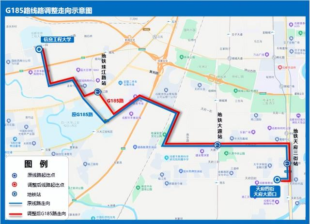 G185路 起訖點(diǎn):信息工程大學(xué)——天府四街天府大道口 線路走向:信息工程大學(xué)發(fā)出,信息工程大學(xué)至黃河路大件路口行駛路線及站點(diǎn)不變,調(diào)整經(jīng)大件路白家段、珠江路、川大路東延線后回原線路運(yùn)行至天府四街天府大道口(終點(diǎn)站);往返一致。