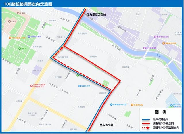 106路 起訖點(diǎn):九里堤公交站——東光小區(qū) 線路走向:九里堤公交站發(fā)出,九里堤公交站至北大街站行駛線路及站點(diǎn)不變,調(diào)整線路經(jīng)東珠市街、太升北路后回原線行駛至東光小區(qū)(終點(diǎn)站);返程不變 站點(diǎn)設(shè)置:取消正通順街(去程);增設(shè)正通順街口(去程)。