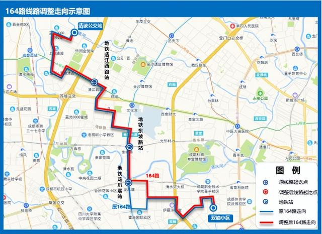 164路 起訖點(diǎn):清波公交站——雙楠小區(qū) 線路走向:清波公交站發(fā)出,清波公交站至青羊大道清風(fēng)街口行駛線路及站點(diǎn)不變,調(diào)整經(jīng)龍騰西路、龍華北路、置信路后回原線路行駛至雙楠小區(qū)(終點(diǎn)站);返程不變 站點(diǎn)設(shè)置:取消地鐵龍爪堰站(去程)、武陽(yáng)大道龍祥路口(去程)、鷺島路(去程)、龍華北路(去程);增設(shè)地鐵龍爪堰站(E口)(去程)、龍華北路北(去程)、龍華北路(去程)。