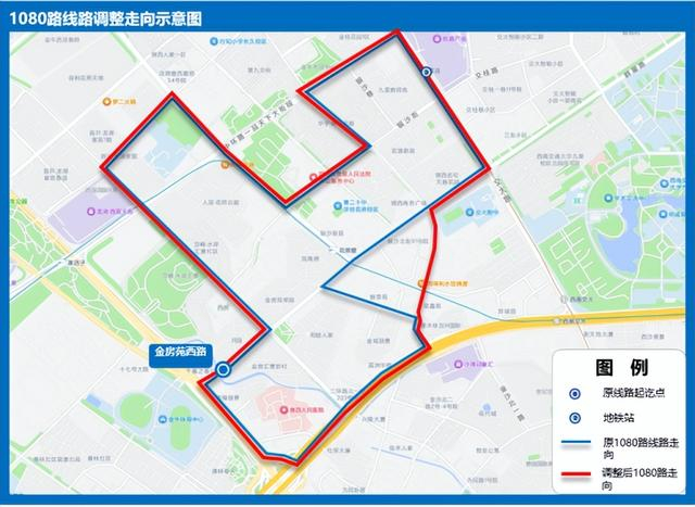 1080路 起訖點(diǎn):金房苑西路——金房苑西路 線路走向:金房苑西路發(fā)出,金房苑西路至銀河路站行駛線路及站點(diǎn)不變,調(diào)整線路經(jīng)銀沙路回原線行駛至金房苑西路(終點(diǎn)站) 站點(diǎn)設(shè)置:取消地鐵花照壁站、銀沙南街;增設(shè)銀沙路。