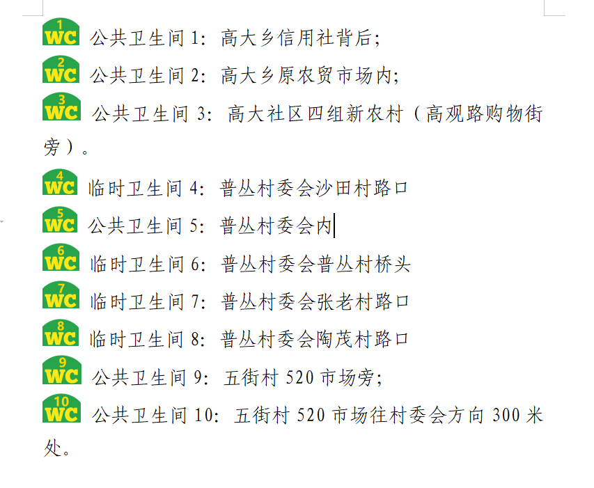 請您愛護環(huán)境衛(wèi)生、文明出行,為了您的便利,提供公共衛(wèi)生間及臨時衛(wèi)生間共10個。