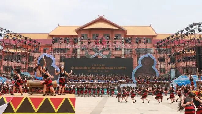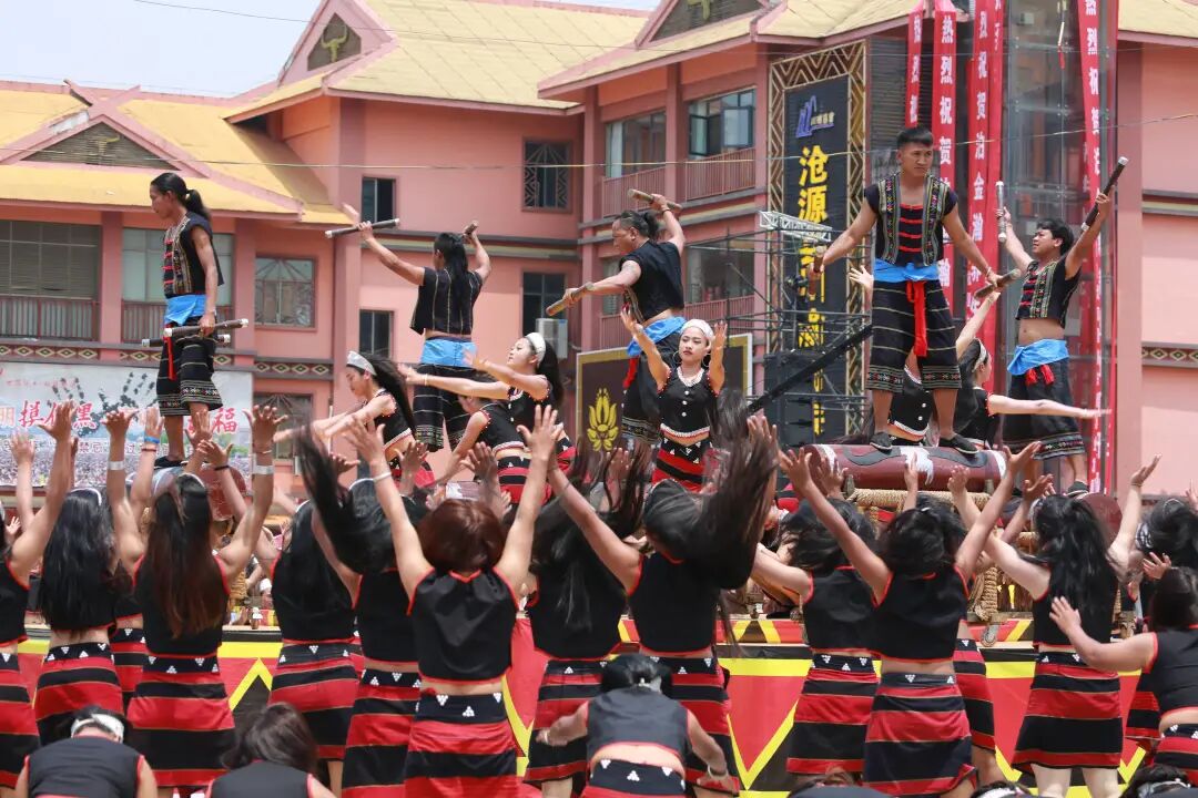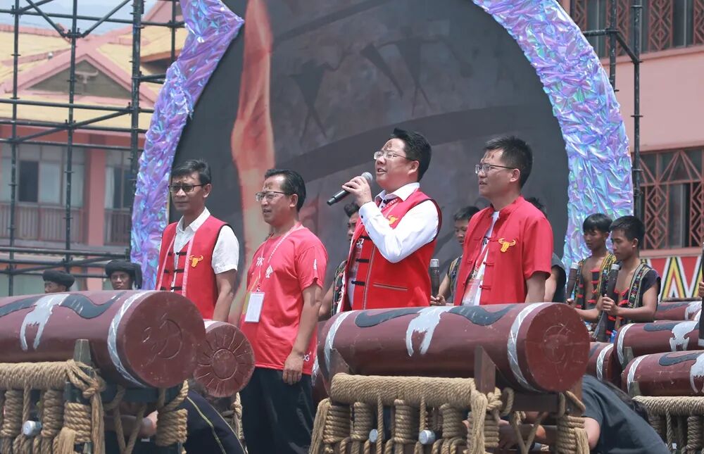 活動現(xiàn)場,“百臺木鼓千人甩發(fā)”表演原始古樸、粗獷豪放、震撼人心,給觀眾帶來了一場極致的視聽盛宴。隨著激情高亢的音樂響起,大家開始用 “娘布落”互相涂抹,互祝健康、平安。歌聲不斷、祝福不停,大家在狂歡中釋放壓力、享受歡樂時光。