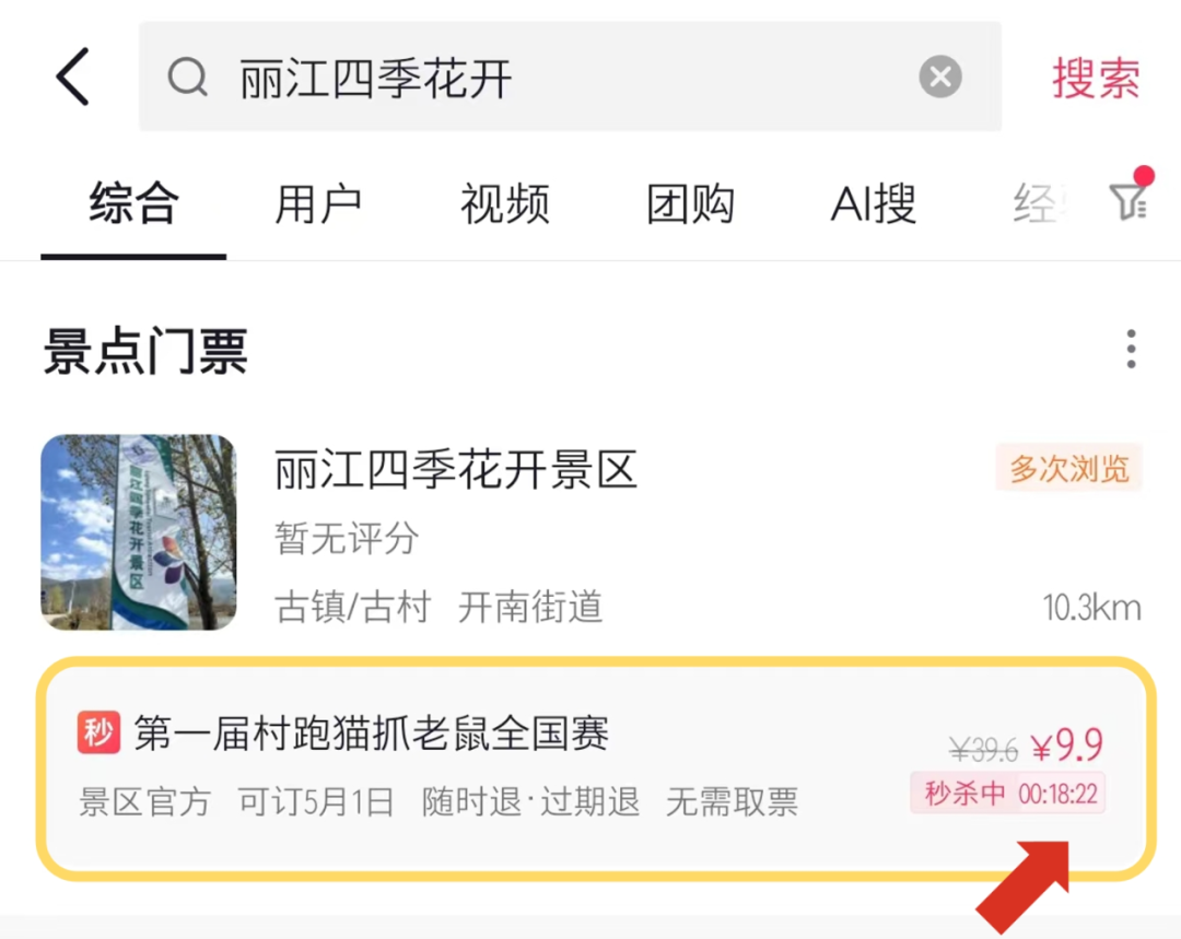 (1)報(bào)名“貓抓老鼠”:打開抖音 → 搜索“麗江四季花開” → 團(tuán)購參賽券 → 前往景區(qū)游客中心核銷、兌票 → 前往集合點(diǎn)參賽登記 → 比賽;