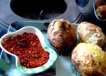 昭陽(yáng)區(qū)盛產(chǎn)洋芋,也喜歡吃洋芋。作為一種街頭小吃,昭通的燒洋芋歷史悠久,備受青睞。街頭巷尾,常常有人,一口鐵鍋,放上材炭(白炭),炭上放著十幾個(gè)大小不等的洋芋,燒好后,用玉米芯或者木片刮得黃生生的,用刀片一切兩半,抹上昭通醬或者撒上辣子面,咬一口,香噴噴,既管飽,又解饞。