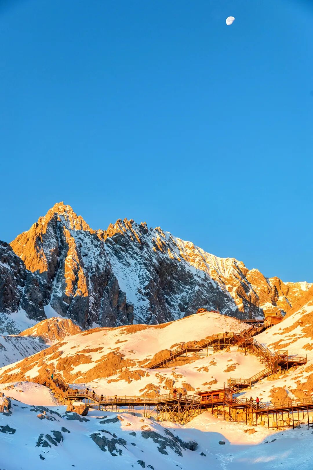 秋天的玉龍雪山,少了夏季的云霧繚繞,多了一份清澈和壯闊。湛藍(lán)的天空下,潔白的雪山巍峨聳立,山頂?shù)姆e雪在陽光的照耀下閃閃發(fā)光。