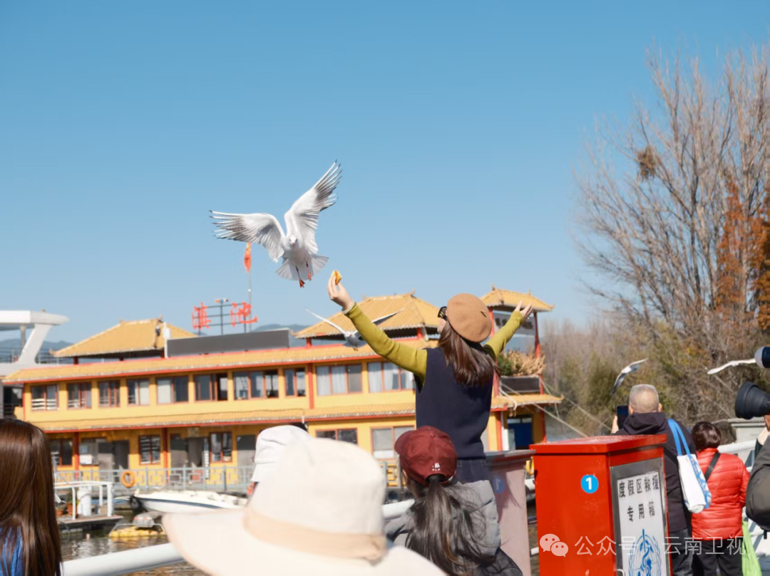 (游客在滇池畔與紅嘴鷗互動 陳思蒙 攝)