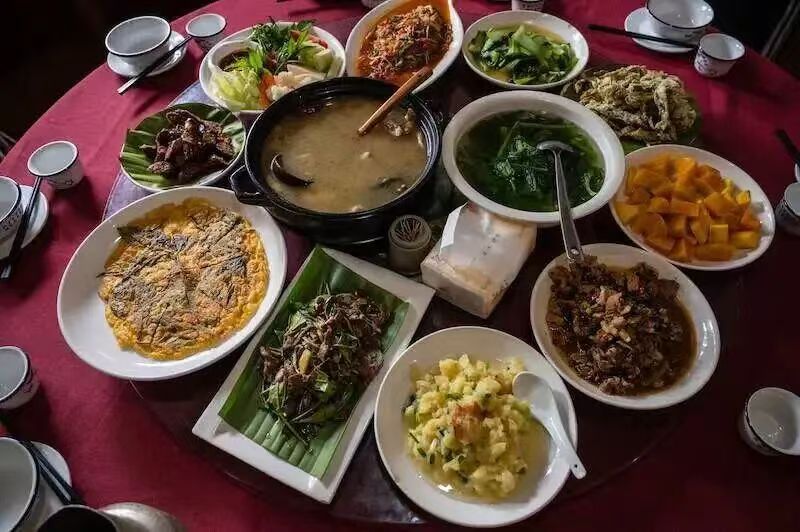 普洱人把茶吃出了新高度。茶葉炒雞蛋,古樹茶的鮮爽與土雞蛋的香醇結(jié)合,清新開胃。在古寨里,還能嘗到螃蟹腳燉土雞等融合了山野氣息的民族美味。